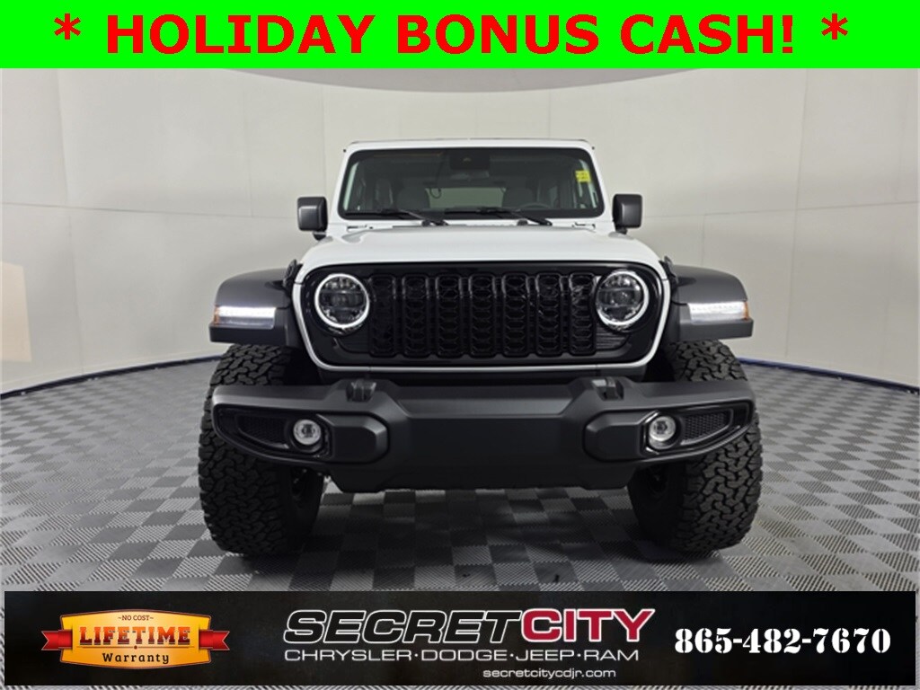 2025 Jeep Wrangler Willys 2.0L I4 DOHC 4WD 8-Speed Automatic Backup Camera, Bluetooth, Life Time Powertrain Warranty, 35" Tire Suspension, 4-Wheel Drive Swing Gate Decal, 4.56 Rear Axle Ratio, 7 & 4 Pin Wiring Harness, 97 MPH Vehicle Max Speed Calibration, Advanced Brake Assist, Automatic Headlamps, Auxiliary Switches, Black Grille, Class II Receiver Hitch, Conventional Differential Front Axle, Corning Gorilla Glass, Dana M210 Wide HD Tube Front Axle, Dana M220 Wide Full Floating Rear Axle, Dana M220 Wide Rear Axle, Daytime Running Lamps LED Accents, Deep Tint Sunscreen Windows, E-Locker Rear Axle, Enhanced Adaptive Cruise Control, Front LED Fog Lamps, Full Speed FWD Collison Warn Plus, Injection Molded Black Rear Bumper, LED Premium Reflector Headlamps, Mold In Color Bumper w/Gloss Black, Molded in Color Rubicon Highline Flare, MOPAR All-Weather Floor Mats, MOPAR Hinge-Gate Reinforcement, MOPAR Jack Spacer, MOPAR Tire Relocation Kit, Off-Road Plus Mode, Power Heated Mirrors, Premium Wrapped Steering Wheel, Quick Order Package 22W Willys, Radio: Uconnect 5 w/12.3" Display, Security Alarm, Steering wheel mounted audio controls, Sun Visors w/Illuminated Vanity Mirrors, Wheel Flare Extensions, Wheels: 17" x 7.5" Painted Black, Wheels: 17" x 8.0" Machined w/Black Pockets, Willy's Suspension, Willys Hood Decal, Xtreme 35 Tire Package.