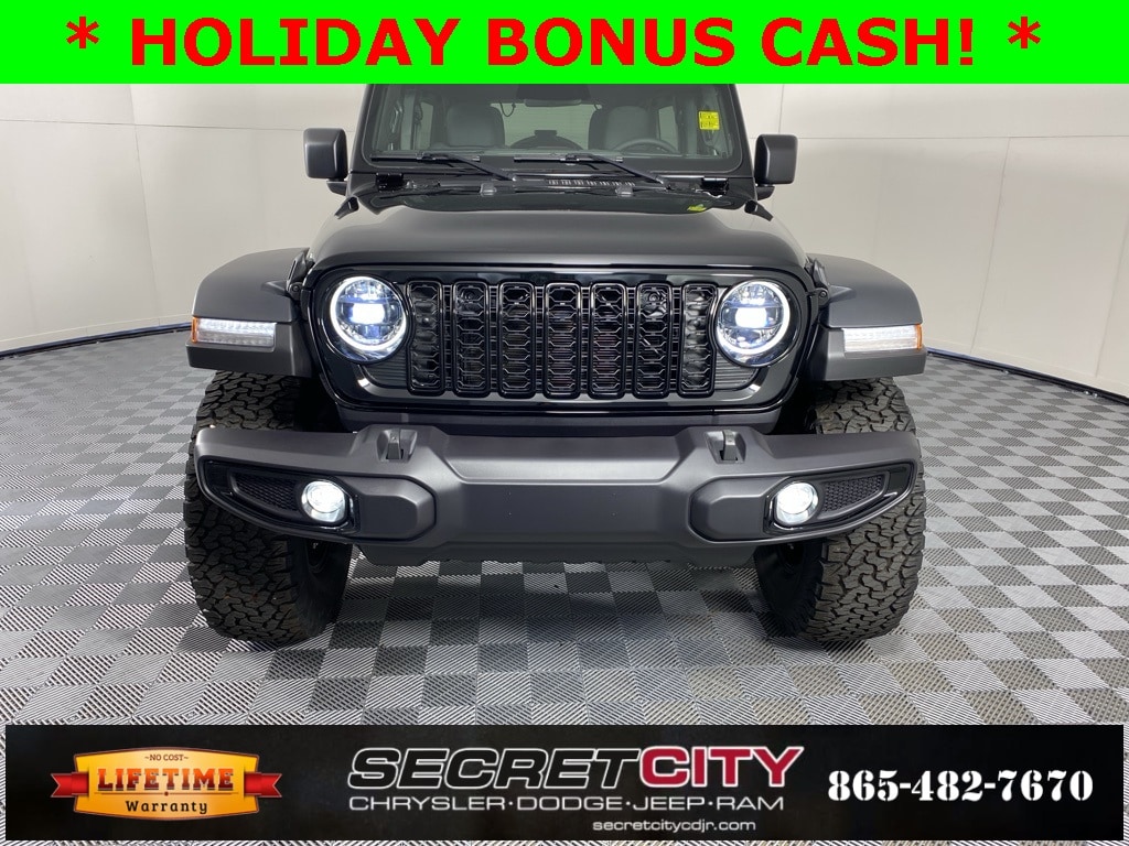 2026 Jeep Wrangler Willys 2.0L I4 DOHC 4WD 8-Speed Automatic Backup Camera, Bluetooth, Apple CarPlay / Android Auto, Life Time Powertrain Warranty, 2-Door Passive Entry, Front Door Locks, 35" Tire Suspension, 4-Wheel Drive Swing Gate Decal, 4.56 Rear Axle Ratio, 7 & 4 Pin Wiring Harness, ABS brakes, Advanced Brake Assist, Air Conditioning w/Auto Temperature Control, Air Filtering, Anti-Lock 4-Wheel Disc Perf Brakes, Apple CarPlay/Android Auto, Automatic Headlamps, Auxiliary Switches, Black Grille, Class II Receiver Hitch, Cluster 7.0" TFT Color Display, Compass, Convenience Group, Conventional Differential Front Axle, Corning Gorilla Glass, Dana M210 Wide HD Tube Front Axle, Dana M220 Wide Rear Axle, Daytime Running Lamps LED Accents, Deep Tint Sunscreen Windows, Delete 4-Wheel Drive Swing Gate Decal, E-Locker Rear Axle, Electronic Stability Control, Emergency/Assistance Call, Enhanced Adaptive Cruise Control, Front LED Fog Lamps, Full Speed Forward Collision Warning Plus, Heated Front Seats, Heated Steering Wheel, Illuminated entry, Injection Molded Black Rear Bumper, LED Premium Reflector Headlamps, Low tire pressure warning, Mold In Color Bumper w/Gloss Black, Molded in Color Rubicon Highline Flare, MOPAR All-Weather Floor Mats, MOPAR Hinge-Gate Reinforcement, Off-Road Plus Mode, ParkView Rear Back-Up Camera, Power Heated Mirrors, Power Top Quarter Window Storage Bag, Premium Wrapped Steering Wheel, Quick Order Package 22W Willys, Radio: Uconnect 5 w/12.3" Display, Rear Window Defroster, Rear Window Wiper/Washer, Remote keyless entry, Remote Start System, Removable Rear Quarter Windows, Security Alarm, Sky 1-Touch Power Top, Sun Visors w/Illuminated Vanity Mirrors, Traction control, Universal Garage Door Opener, Wheel Flare Extensions, Wheels: 17" x 8" Machined w/Black Pockets, Willy's Suspension, Willys Hood Decal, Xtreme 35" Tire Package.