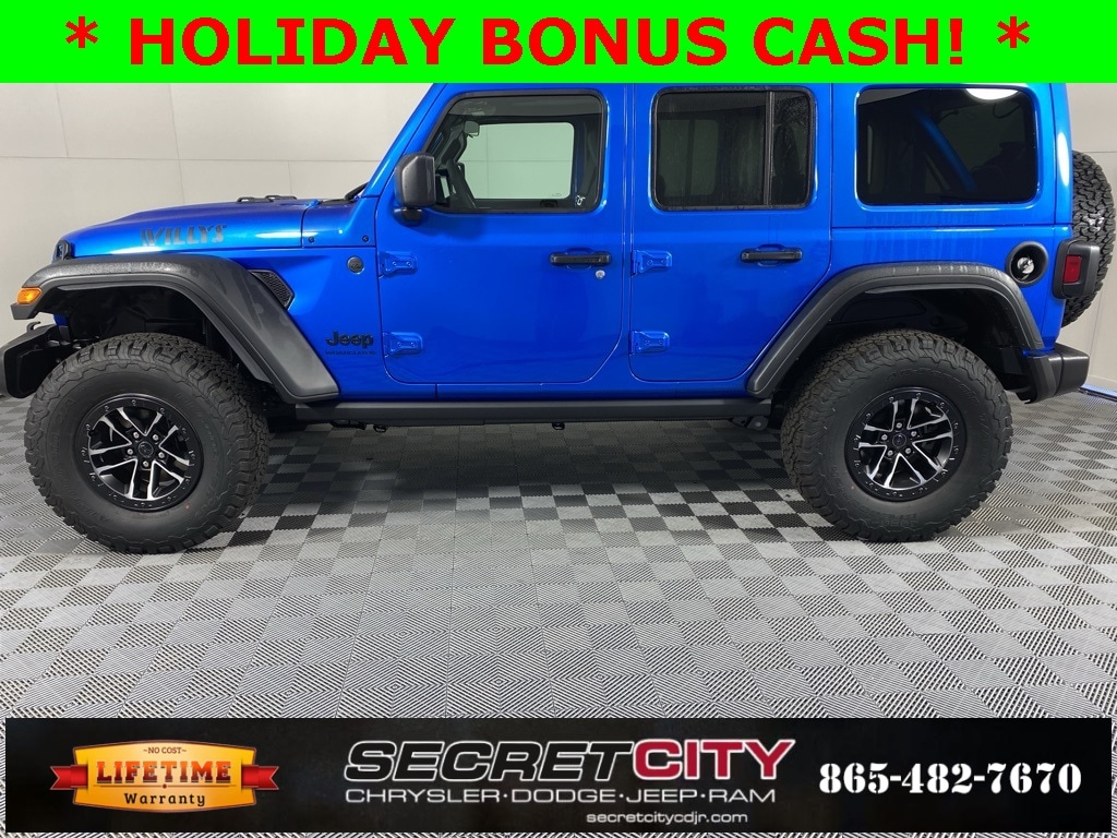 2026 Jeep Wrangler Willys 2.0L I4 DOHC 4WD 8-Speed Automatic Backup Camera, Bluetooth, Apple CarPlay / Android Auto, Life Time Powertrain Warranty, 2-Door Passive Entry, Front Door Locks, 35" Tire Suspension, 4-Wheel Drive Swing Gate Decal, 4.10 Rear Axle Ratio, 7 & 4 Pin Wiring Harness, ABS brakes, Advanced Brake Assist, Air Conditioning w/Auto Temperature Control, Air Filtering, Anti-Lock 4-Wheel Disc Perf Brakes, Automatic Headlamps, Auxiliary Switches, Black Grille, Class II Receiver Hitch, Cluster 7.0" TFT Color Display, Compass, Convenience Group, Conventional Differential Front Axle, Corning Gorilla Glass, Dana M210 Wide HD Tube Front Axle, Dana M220 Wide Rear Axle, Daytime Running Lamps LED Accents, Deep Tint Sunscreen Windows, Delete 4-Wheel Drive Swing Gate Decal, E-Locker Rear Axle, Electronic Stability Control, Emergency/Assistance Call, Enhanced Adaptive Cruise Control, Front LED Fog Lamps, Full Speed Forward Collision Warning Plus, Heated Front Seats, Heated Steering Wheel, Illuminated entry, Injection Molded Black Rear Bumper, LED Premium Reflector Headlamps, Low tire pressure warning, Mold In Color Bumper w/Gloss Black, Molded in Color Rubicon Highline Flare, MOPAR All-Weather Floor Mats, MOPAR Hinge-Gate Reinforcement, Off-Road Plus Mode, ParkView Rear Back-Up Camera, Power Heated Mirrors, Power Top Quarter Window Storage Bag, Premium Wrapped Steering Wheel, Quick Order Package 22W Willys, Rear Window Defroster, Rear Window Wiper/Washer, Remote keyless entry, Remote Start System, Removable Rear Quarter Windows, Security Alarm, Sky 1-Touch Power Top, Sun Visors w/Illuminated Vanity Mirrors, Traction control, Universal Garage Door Opener, Wheel Flare Extensions, Wheels: 17" x 7.5" Painted Black, Wheels: 17" x 8" Machined w/Black Pockets, Willy's Suspension, Willys Hood Decal, Xtreme 35" Tire Package.