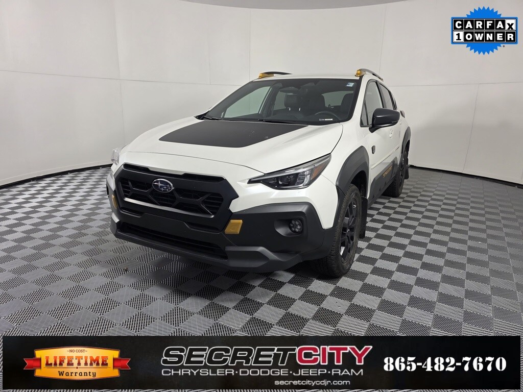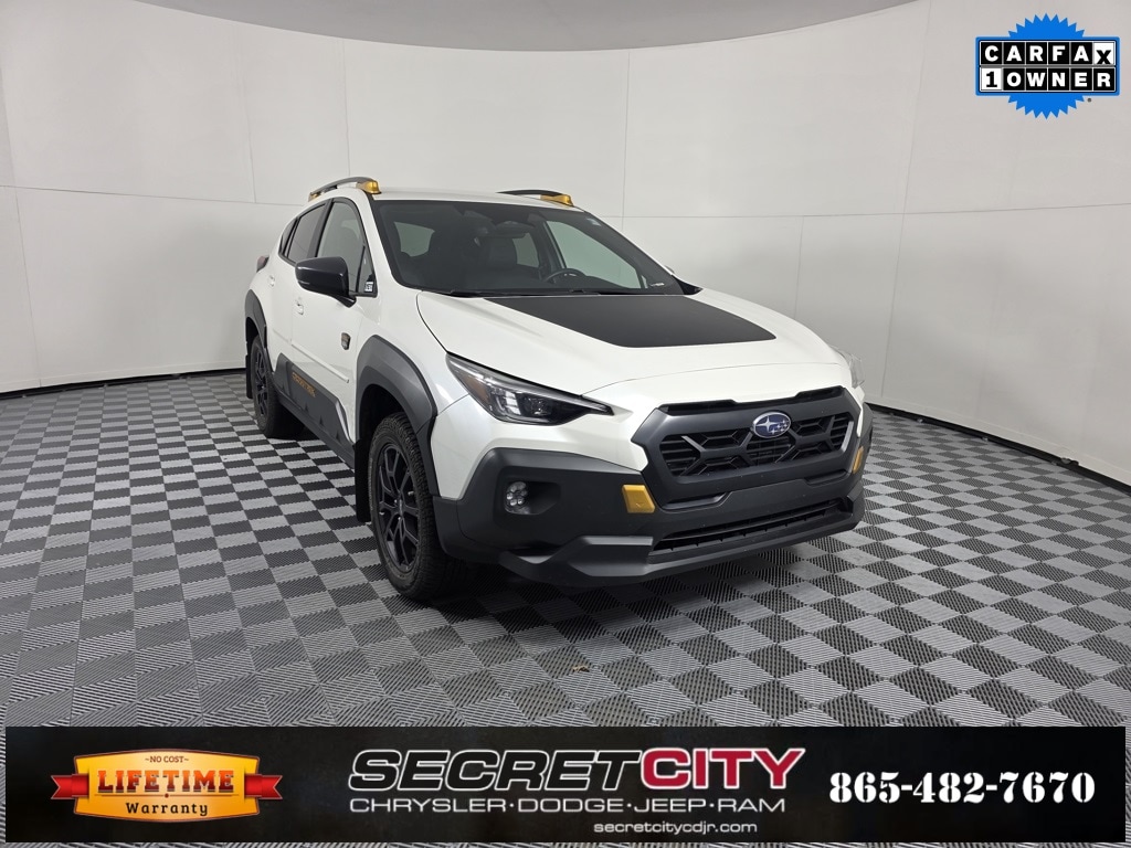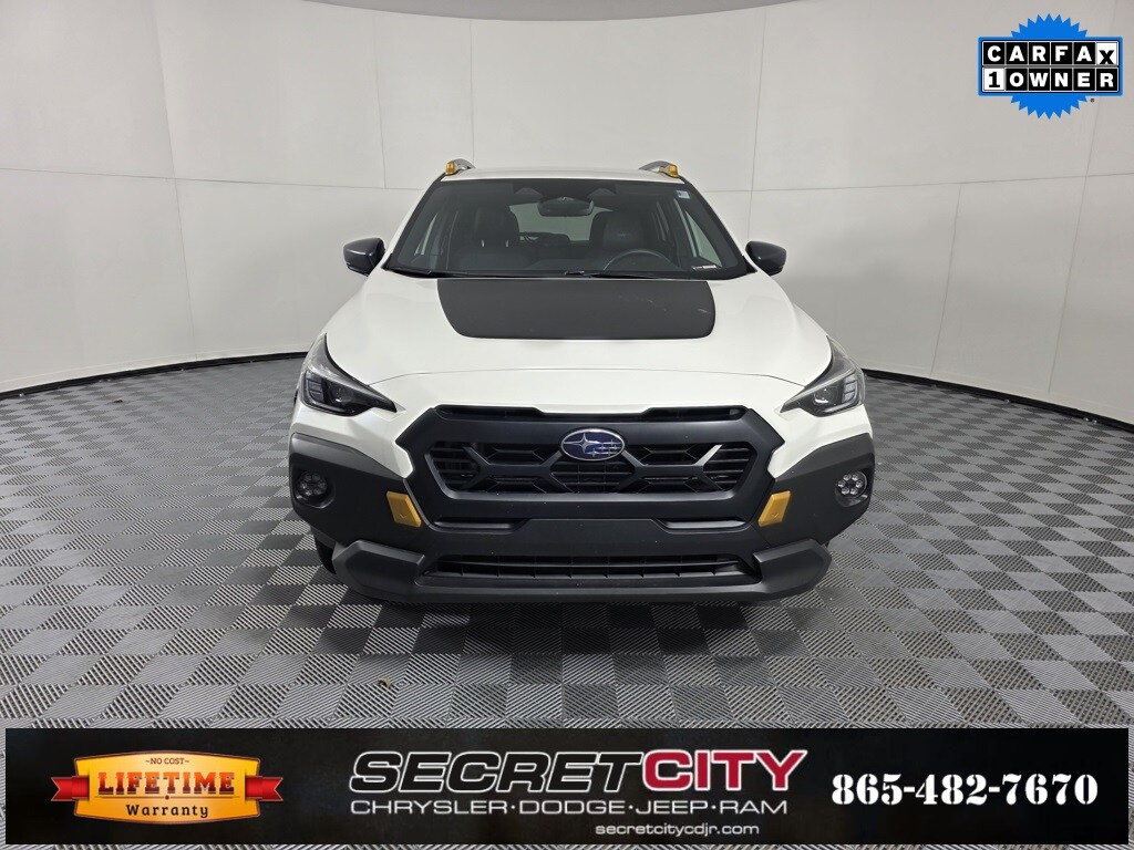 2024 Subaru Crosstrek Wilderness 2nd Row Sunshade, 4-Wheel Disc Brakes, 4.11 Axle Ratio, 6 Speakers, ABS brakes, Air Conditioning, Alloy wheels, AM/FM radio: SiriusXM, Anti-whiplash front head restraints, Auto High-beam Headlights, Auto-Dimming Exterior Mirror w/Approach Light, Auto-Dimming Mirror w/Compass & HomeLink, Automatic temperature control, Brake assist, Bumpers: body-color, Carpeted Floor Mats, Crosstrek Mirror Package, Driver door bin, Driver vanity mirror, Dual front impact airbags, Dual front side impact airbags, Electronic Stability Control, Emergency communication system: STARLINK Safety and Security (Subscription Required), Exterior Parking Camera Rear, Four wheel independent suspension, Front anti-roll bar, Front Bucket Seats, Front Center Armrest, Front dual zone A/C, Front fog lights, Front reading lights, Fully automatic headlights, Heated door mirrors, Heated Front Bucket Seats, Heated front seats, Illuminated entry, Knee airbag, Leather Shift Knob, Low tire pressure warning, Occupant sensing airbag, Outside temperature display, Overhead airbag, Overhead console, Panic alarm, Passenger door bin, Passenger vanity mirror, Power door mirrors, Power steering, Power windows, Radio data system, Radio: Subaru STARLINK 11.6" Multimedia Plus Sys, Rear anti-roll bar, Rear Bumper Cover - Wilderness, Rear seat center armrest, Rear window defroster, Rear window wiper, Remote keyless entry, Security system, Speed control, Speed-sensing steering, Split folding rear seat, Spoiler, Standard Model, STARLINK/Apple CarPlay/Android Auto, Steering wheel mounted audio controls, Sunshade - Windshield, Tachometer, Telescoping steering wheel, Tilt steering wheel, Traction control, Trip computer, Turn signal indicator mirrors, Variably intermittent wipers, Wheels: 17" x 7.0J Matte Black Aluminum Alloy, Wilderness StarTex Upholstery.